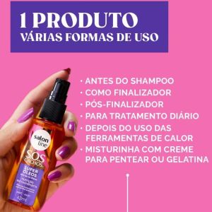 Con el cabello seco o húmedo, aplique unas gotas de aceite de tratamiento S.O.S Curls en la palma de las manos y extiéndalo bien desde el largo hasta la punta. Termina como prefieras. En el enjuague. - (Con el cabello seco o húmedo, aplique unas gotas del aceite de Tratamiento S.O.S Richos en la palma de las manos y extienda bien a lo largo de las puntas de los hilos. Finalice como prefiera. sin enjuague.)